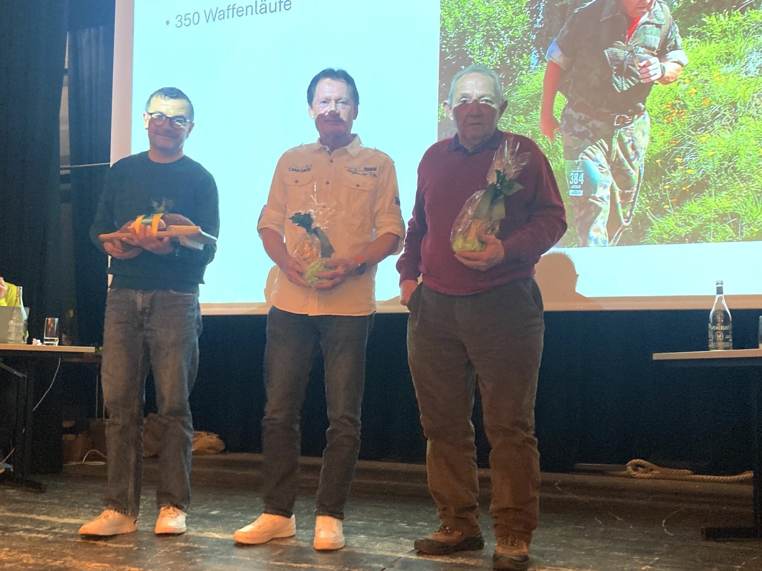 Beim schönsten Traktandum, den Ehrungen, sind mehrere Mitglieder auf die Bühne gerufen worden: Marc Hungerbühler für 100 Waffenläufe, Felix Zehnder für 250 Waffenläufe, Thomas Niethammer für 300 Waffenläufe und Arthur Sumi für 350 Waffenläufe! Dan Uebersax, Lauf- und Kursleiter vom Einsteigerkurs, durfte für seine Arbeit einen Gutschein entgegennehmen, ebenso Kilian Küng und Kurt Hugentobler für die Organisation des Veteranentreffs, Vreni und Felix Schenk für ihren ausserordentlichen Einsatz beim Panoramalauf sowie Vreni Tschann, unsere gute Seele und Chefdekorateurin für zehn Jahre Vorstandstätigkeit.