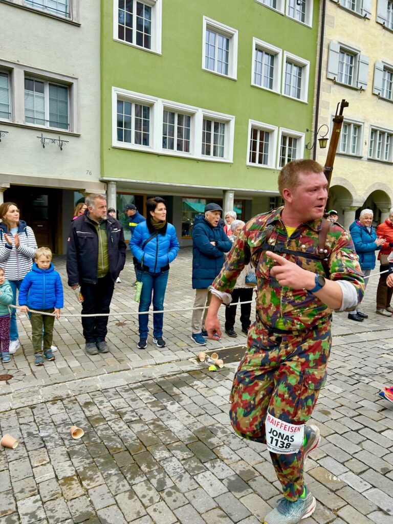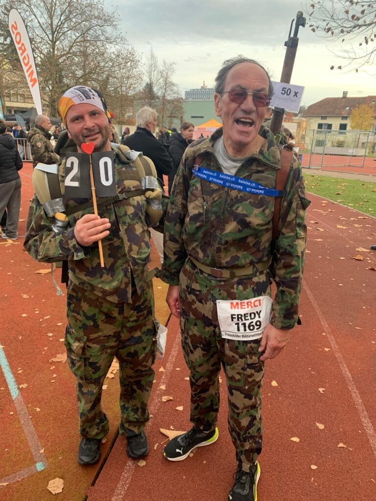 Für ein Highlight der besonderen Art sorgt Fredy Wirth, er absolviert den Frauenfelder Waffenlauf zum 50. Mal und feiert damit ein seltenes Jubiliäum. Vereinskolleginen und -kollegen stehen bei seinem Zieleinlauf mit den gelben Vereinsschirmen Spalier und erweisen dem Jublilär die verdiente Ehre. Herzliche Gratulation, Fredy!
